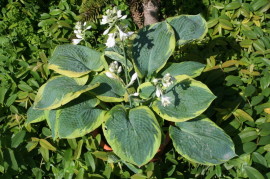 Übersicht blaulaubige Hosta mit gelbem Rand